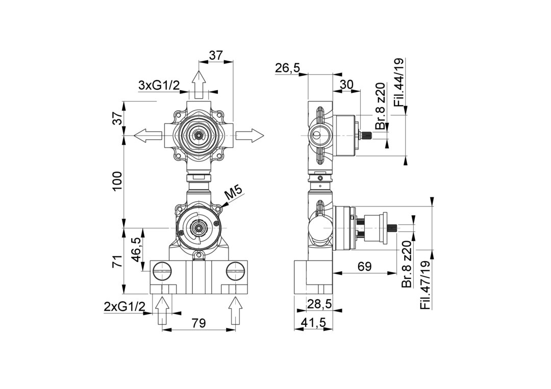 001-19-01A-005 CW617N 2x G 1/2" 3x G 1/2" 100 mm VT28 3 vie / 3 ways Si / Yes 8 z20
