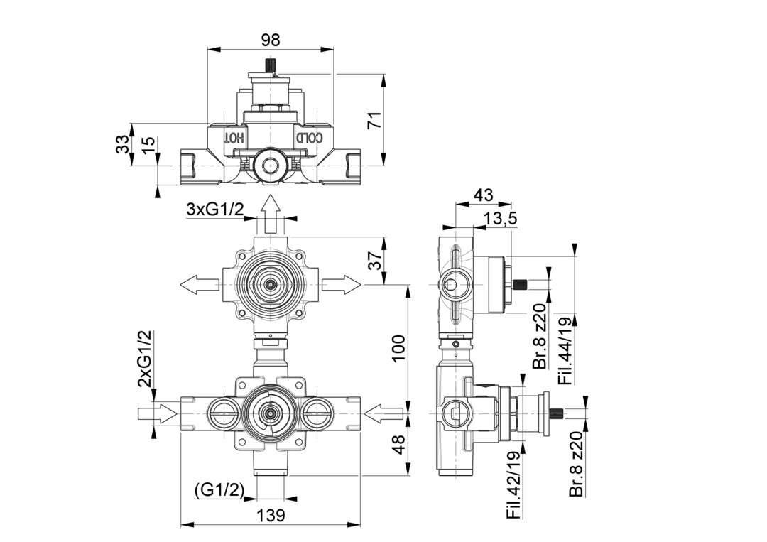 | 001-19-01A-009 | CW617N | 2x G 1/2" | 3x G 1/2" | 100 mm | VT28 | 3 vie / 3 ways | Si / Yes | 8 z20 |
