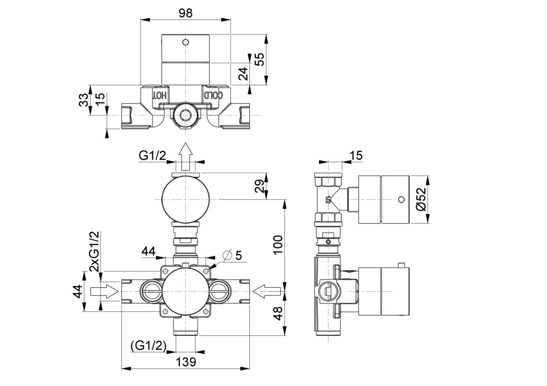| 001-19-01A-010 | CW617N | 2x G 1/2" | G 1/2" | 100 mm | G 1/2" | VT28 | ⌀ 52 mm |