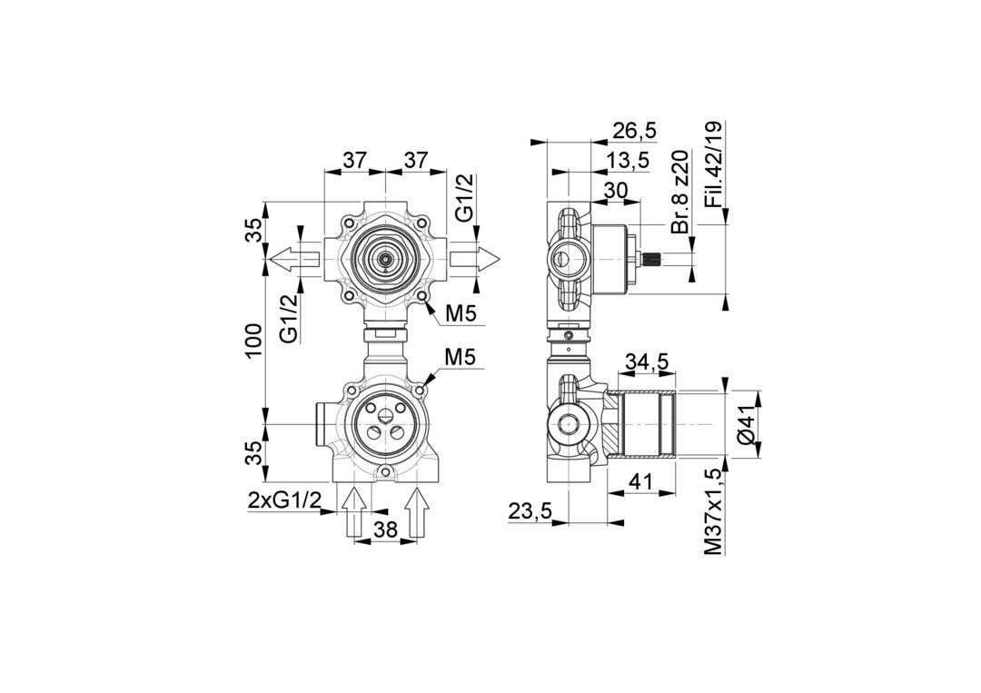 | 001-19-01A-016 | AISI316L | 2x G 1/2" | 2x G 1/2" | M37x1,5 | 100 mm | 35 mm | 2 vie / 2 ways | No | 8 z20 |