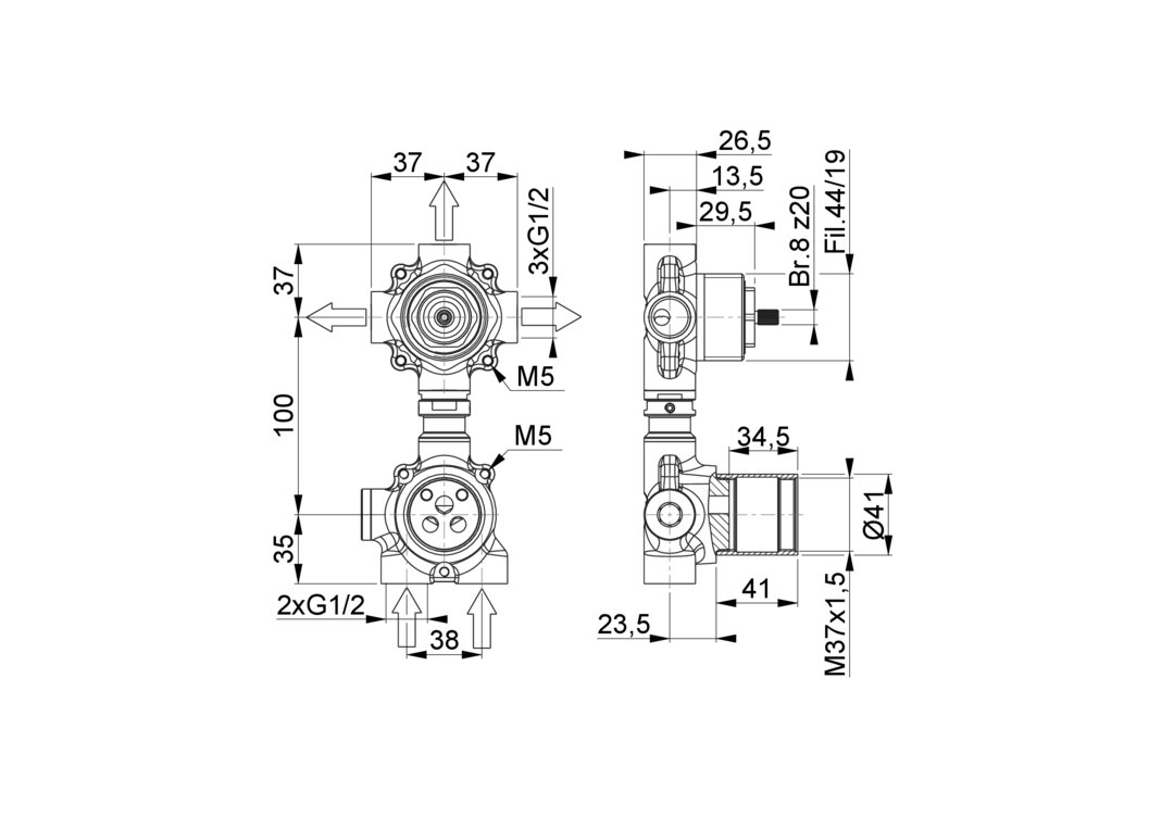 | 001-19-01A-017 | AISI316L | 2x G 1/2" | 3x G 1/2" | M37x1,5 | 100 mm | 35 mm | 3 vie / 3 ways | No | 8 z20 |
