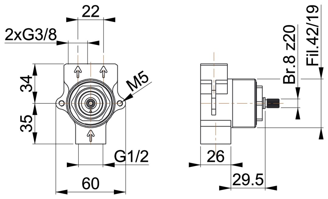 | MIDEV017Ta1 | CW617N | G 1/2" | 2x G 3/8" | 42/19 | 2 vie / 2 ways | No | 8 z20 | 43,9 l/min | |