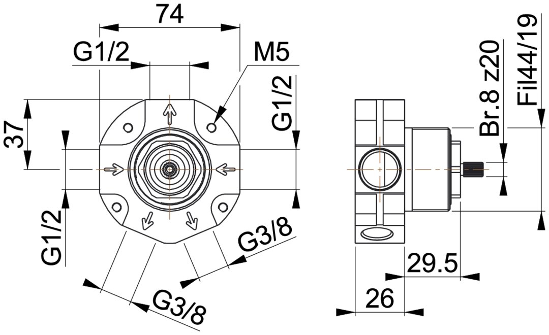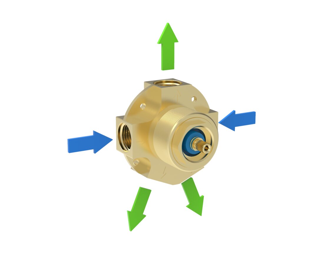 | MIDEV022Ta | CW617N | 2x G 1/2" | 1x G 1/2" + 2x G 3/8" | 3 vie / 3 ways | No | 8 z20 | 39,9 l/min | |