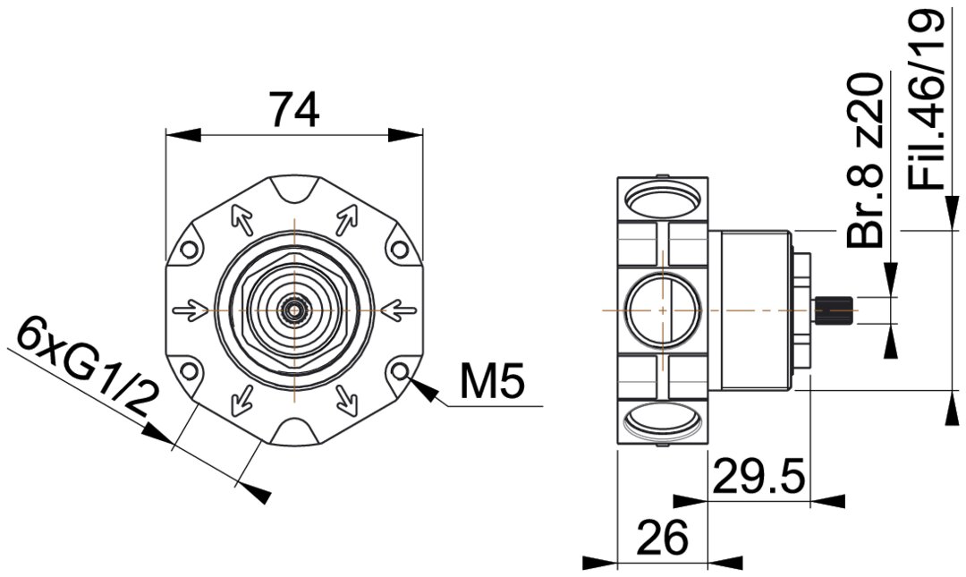| MIDEV024Ta | CW617N | G 1/2" | 4x G 1/2" | 46/19 | 4 vie / 4 ways | No | 8 z20 | G 1/2" | 36,9 l/min | |