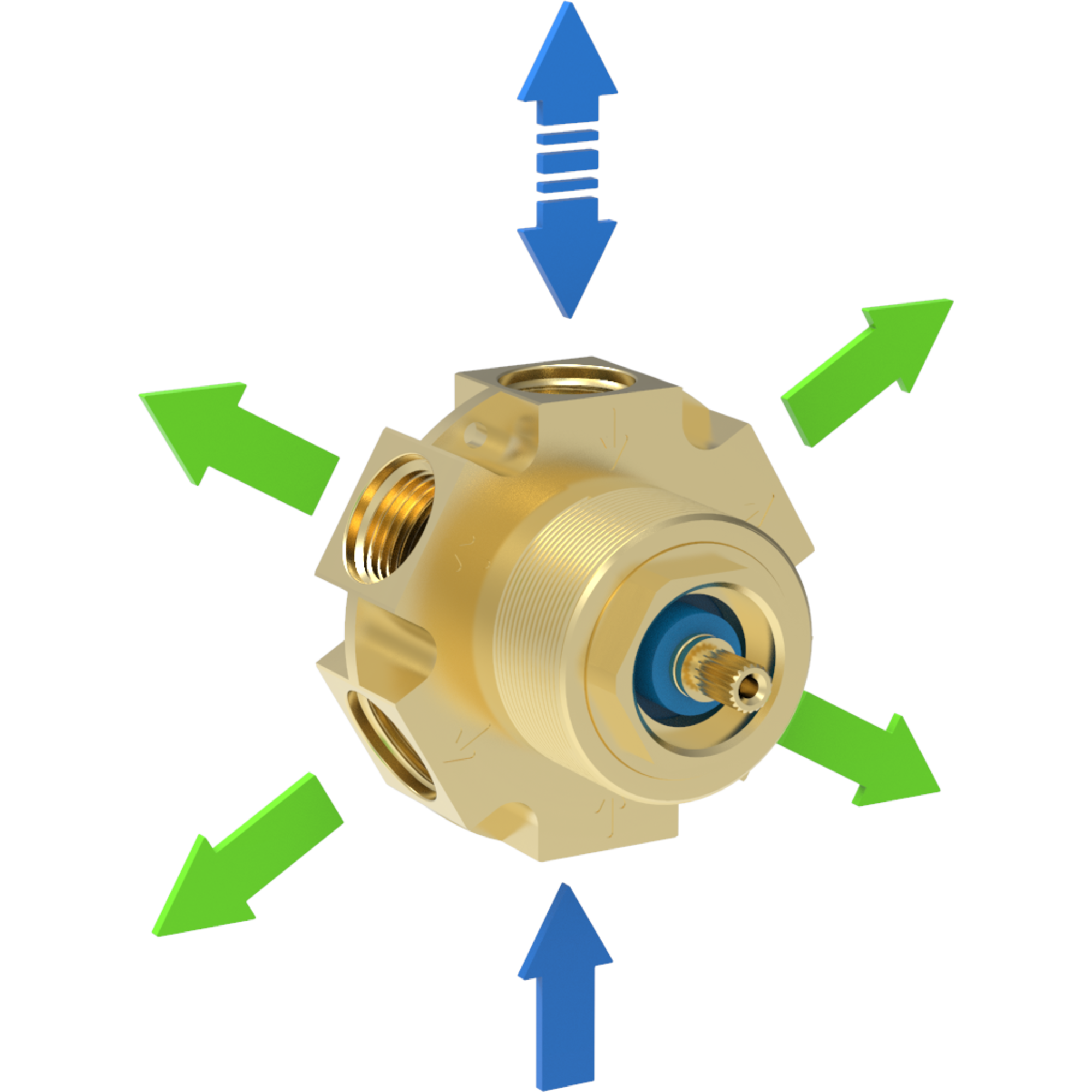 Machined from brass rod diverter with 1 inlet, 4 outlets and 1 through connection