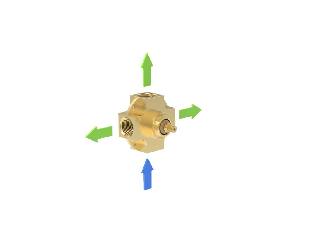 Machined from brass rod mini diverter with 1 inlet and 3 outlets