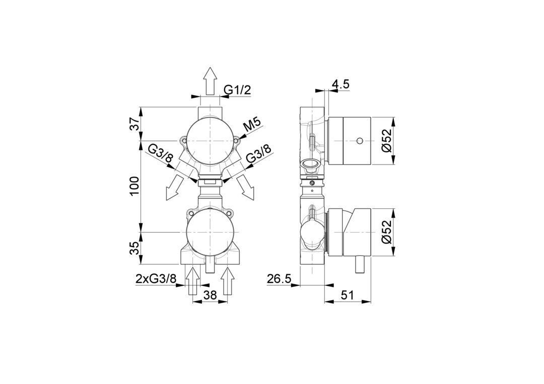 | MIMID001Ca | CW617N | 2x G 3/8" | 1x G 1/2" + 2x G 3/8" | 100 mm | 35 mm | 3 vie / 3 ways | No | ⌀ 52 mm |