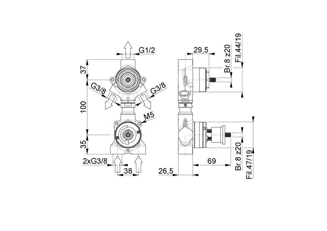 | MITID017Ta0 | CW617N | 2x G 3/8" | 1x G 1/2" + 2x G 3/8" | 100 mm | VT28 | 3 vie / 3 ways | Si / Yes | 8 z20 |