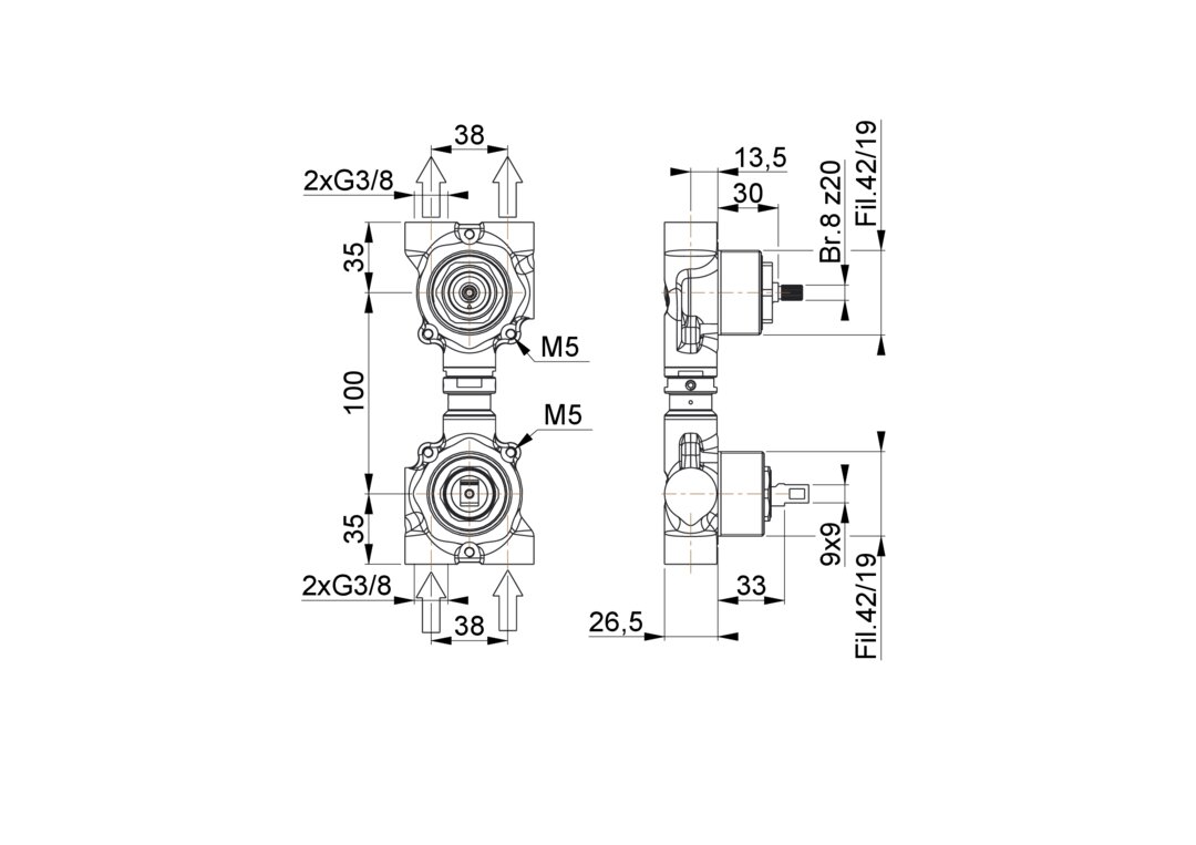 | 001-19-01A-018 | AISI316L | 2x G 3/8" | 2x G 3/8" | 100 mm | 35 mm | 2 vie / 2 ways | No | 9x9 mm | 8 z20 |