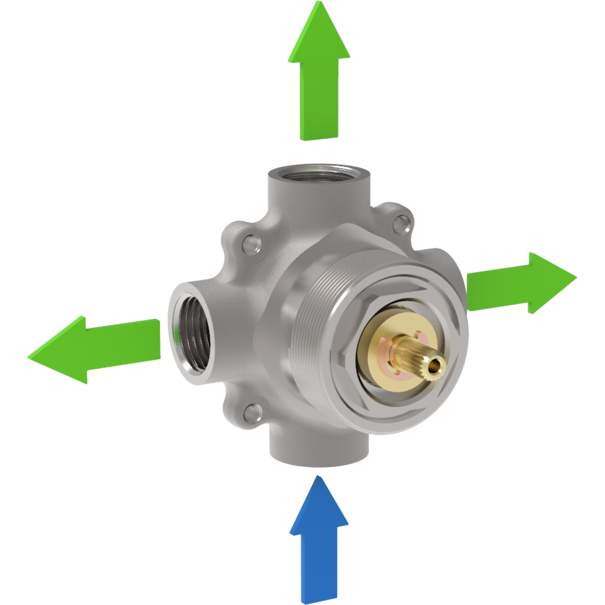 Forged diverter equipped with Flühs diverter cartridge with 1 inlet and 3 outlets