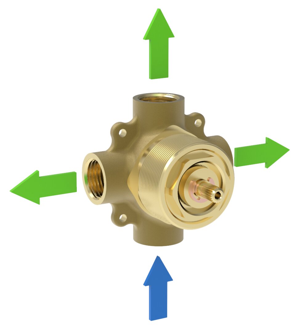 Forged diverter equipped with Flühs diverter cartridge with 1 inlet and 3 outlets