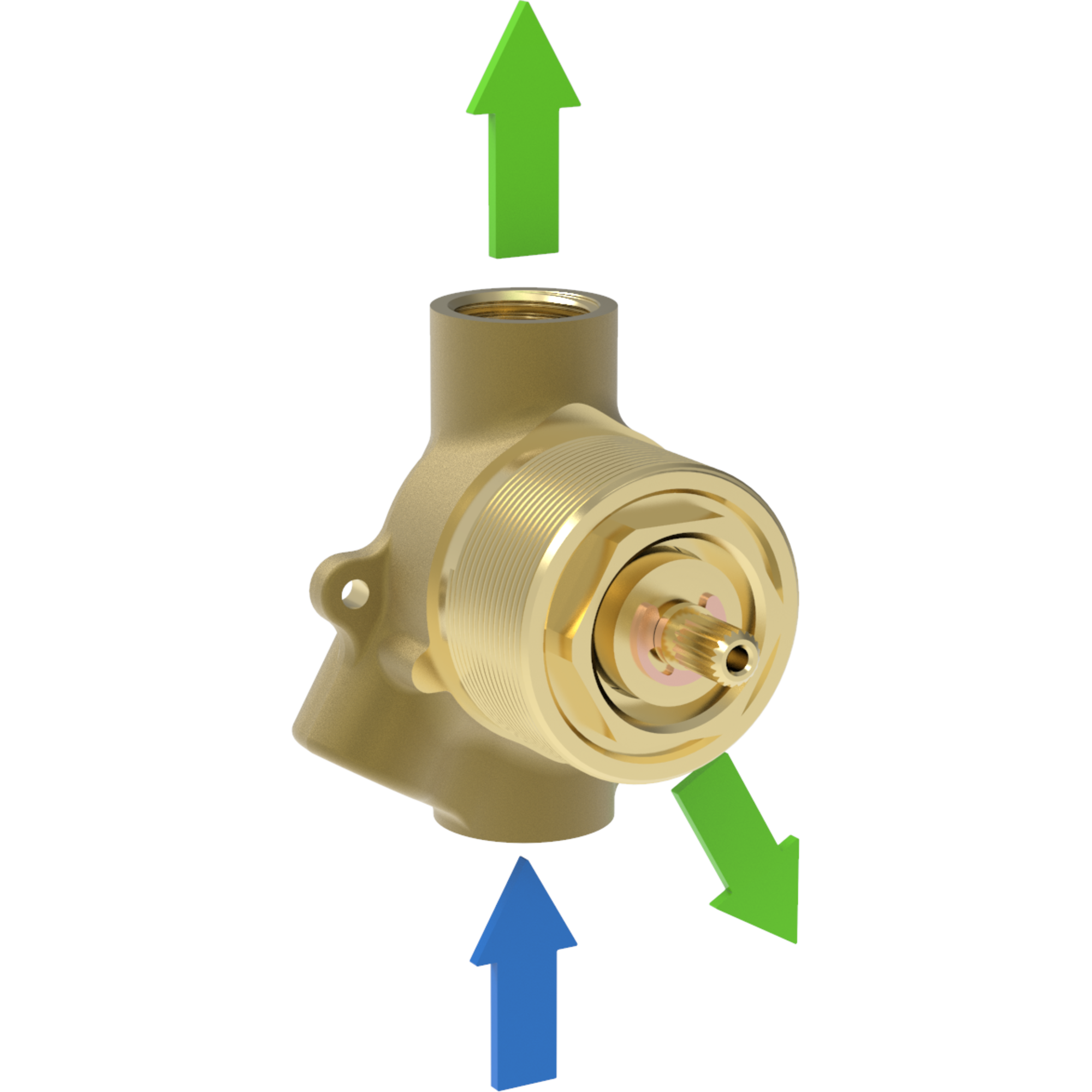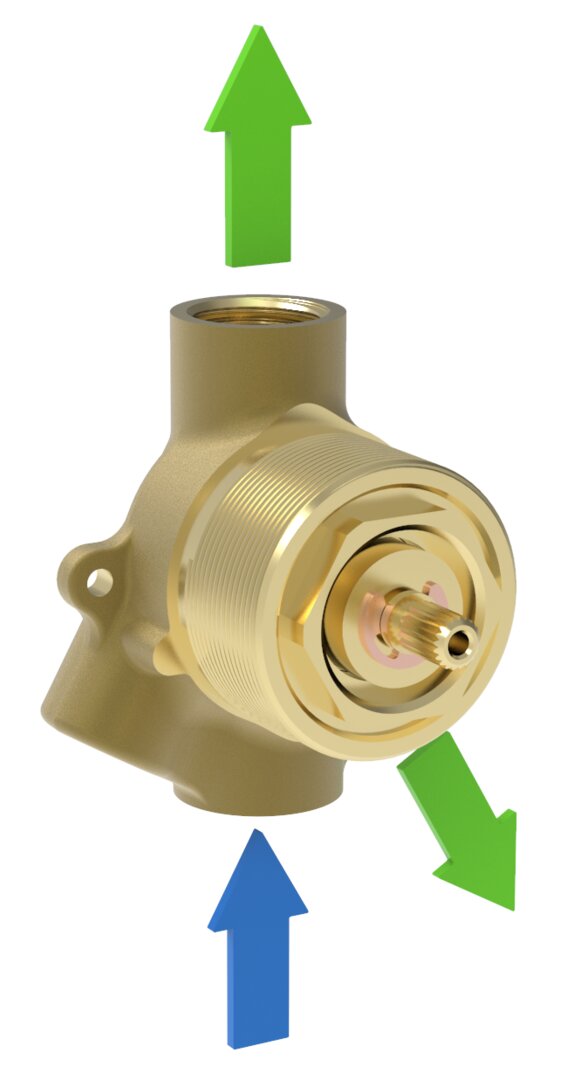 Forged diverter equipped with Flühs diverter cartridge with 1 inlet and 2 outlets
