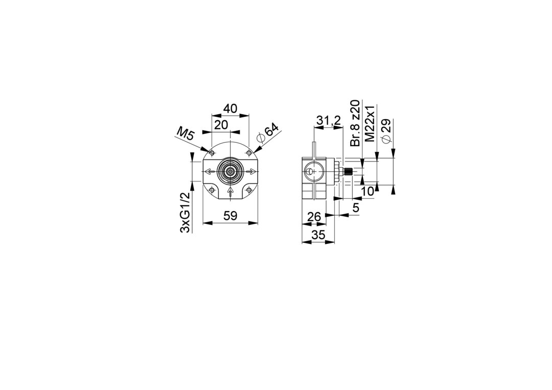 | MIDEV046Ta | CW617N | G 1/2" | 2x G 1/2" | M22x1 | 2 vie / 2 ways | No | 8 z20 | |