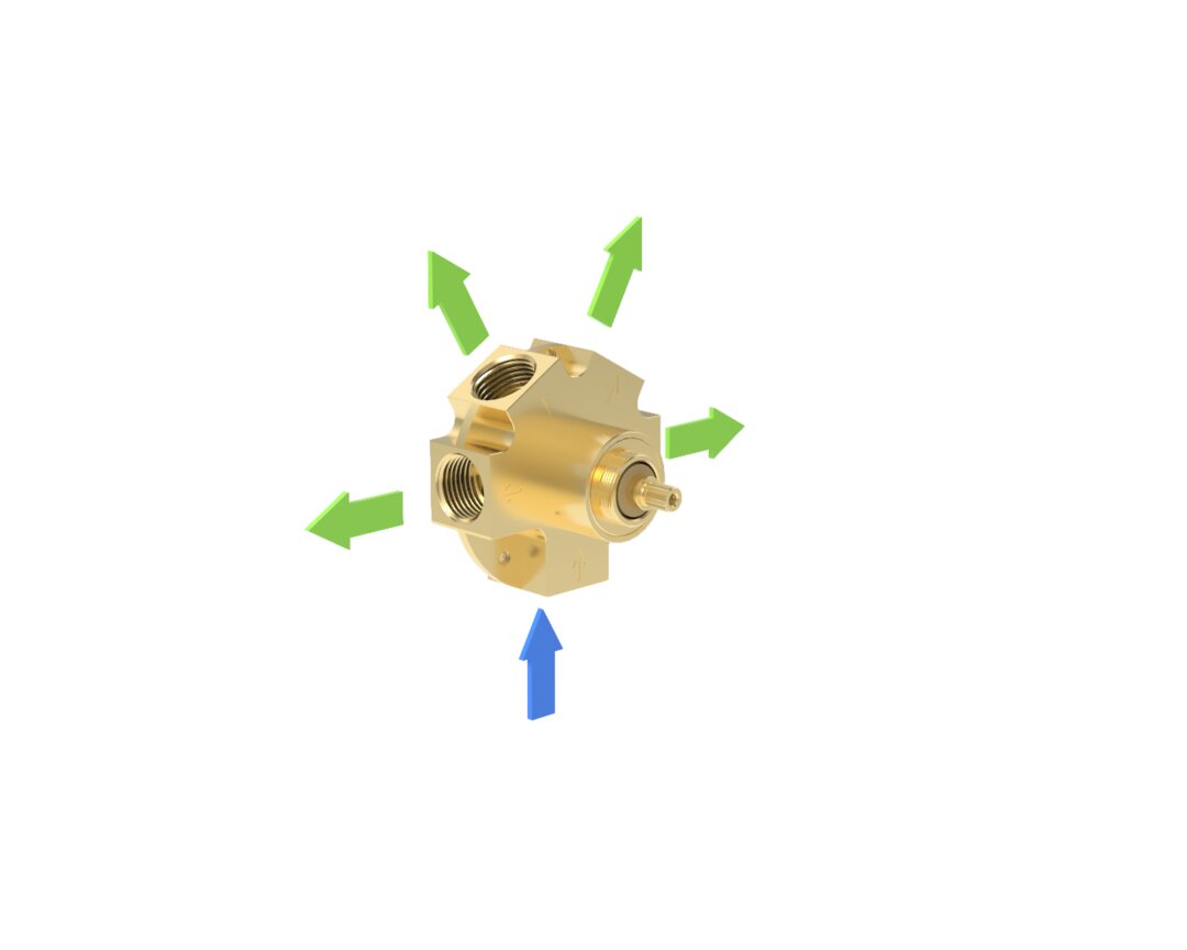 Machined from brass rod mini diverter with 1 inlet and 4 outlets